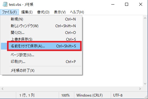 Windows10環境で新しくVBSファイルを作成した場合は、最初にウィンドウ上部の[ファイル]→[名前を付けて保存]などを選択し、保存先やファイル名を指定するダイアログを表示します。