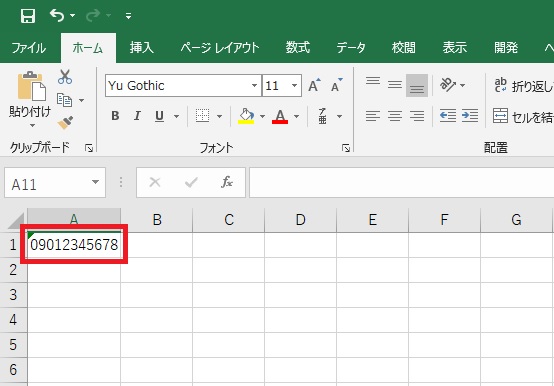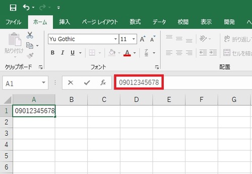 まず、左上のセルに電話番号である「09012345678」という番号を以下の様に入力します。