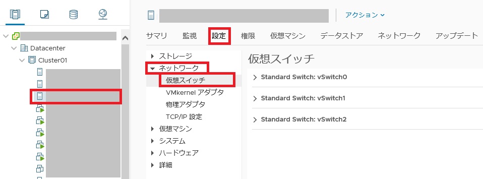 vSphere Clientから仮想スイッチやポートグループの登録をする場合は、以下の画面操作から設定画面を表示できます。
