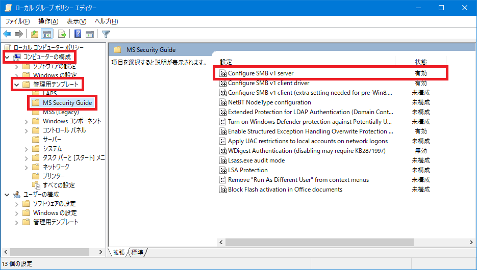 「コンピューターの構成」→「管理用テンプレート」→「MS Security Guide」